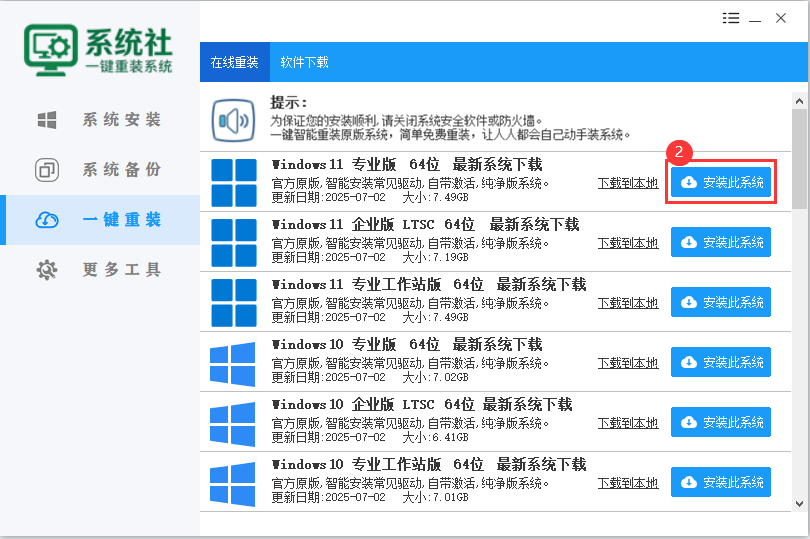 下载软件完软件后,正常打开("系统社一键重装系统"),①点击【一键重装】。如下图所示